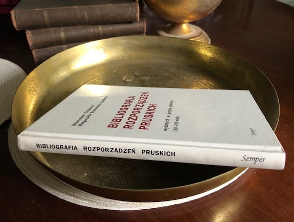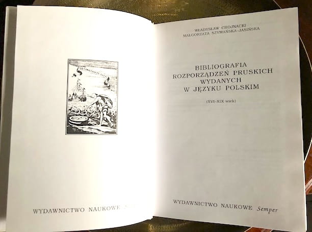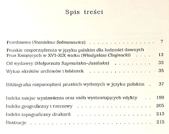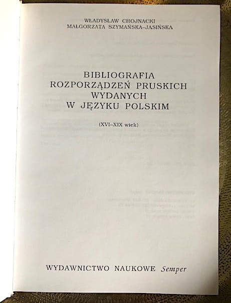 Władysław Chojnacki, Małgorzata Szymańska–Jasińska "Bibliografia rozporządzeń pruskich wydanych w języku polskim (XVI–XIX wiek)" Z przedmową Stanisława Salmonowicza. ISBN 83-86951-90-7 [B5, s. 224, ilustracje, indeksy: rzeczowy, osobowy, topograficzny, drukarń; oprawa twarda] Spis treści Przedmowa (Stanisław Salmonowicz) Pruskie rozporządzenia w języku polskim dla ludności dawnych Prus Książęcych w XVI-XIX wieku (Władysław Chojnacki) Od wydawcy (Małgorzata Szymańska-Jasińska) Wykaz skrótów archiwów i bibliotek Bibliografia rozporządzeń pruskich wydanych w języku polskim Indeks miejsc wystawienia oraz osób wystawiających edykty Indeks geograficzny i rzeczowy Indeks topograficzny drukarń